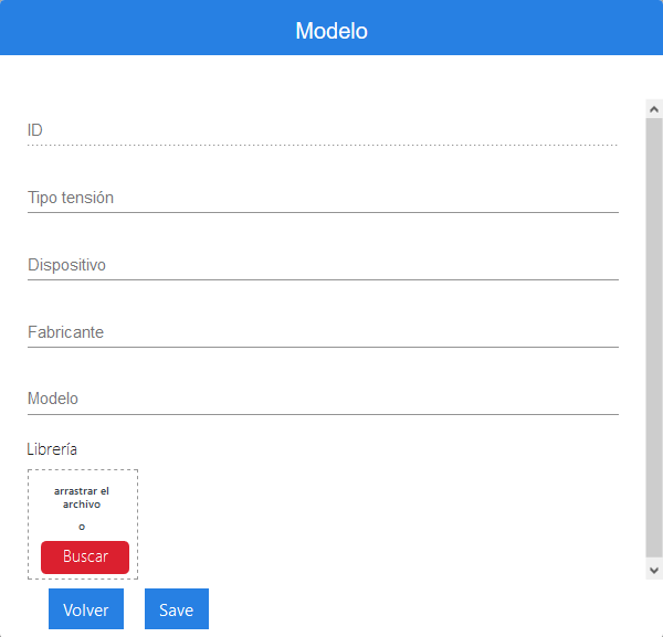 Para crear un modelo es necesario asignarle un tipo de tensión (AT/BT), el tipo de dispositivo (Interruptor, Seccionador…), el fabricante y su nombre.