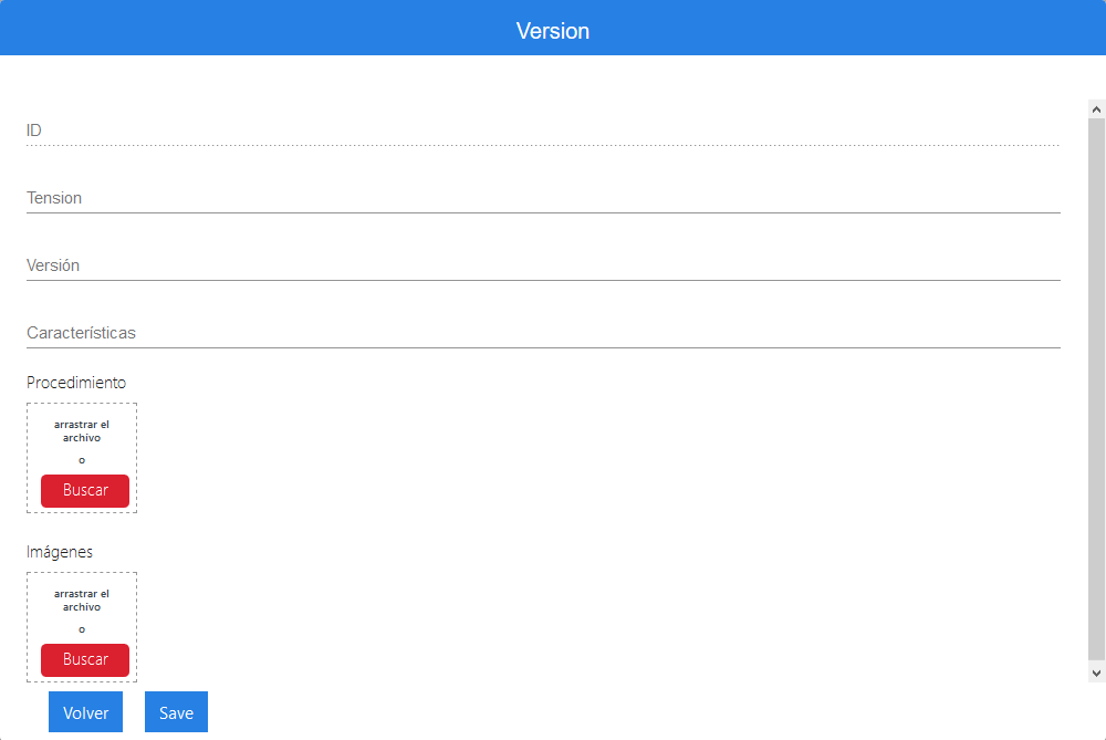 Se mostrará la ventana para rellenar todos los datos de la versión, como la tensión, el nombre y las características. Además, es posible cargar el procedimiento, (que pueden ser varios documentos) y las imágenes que sean necesarias.